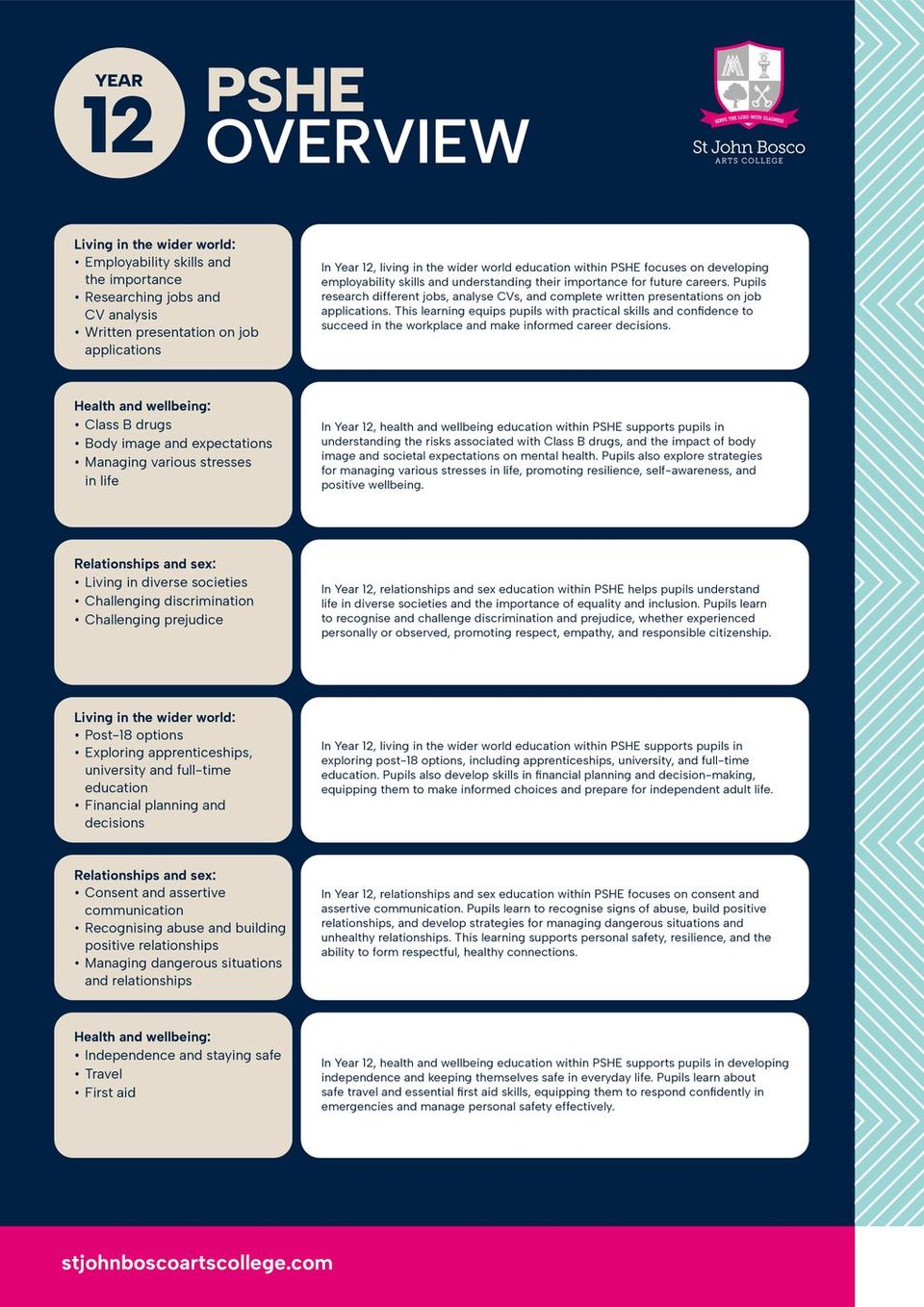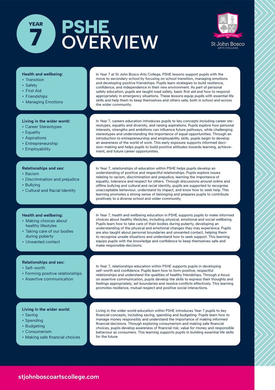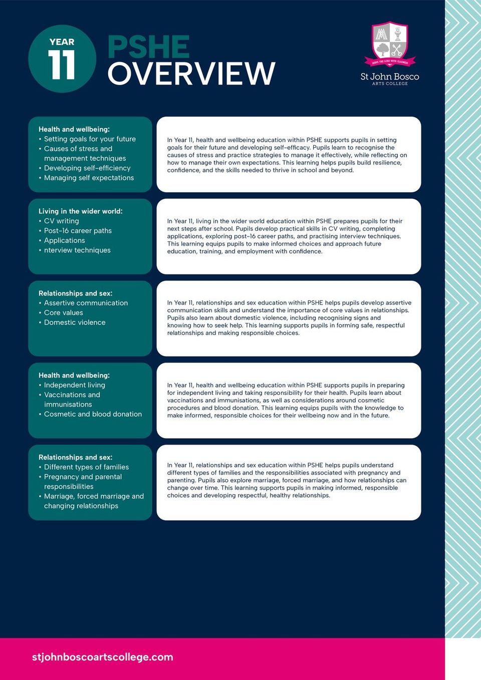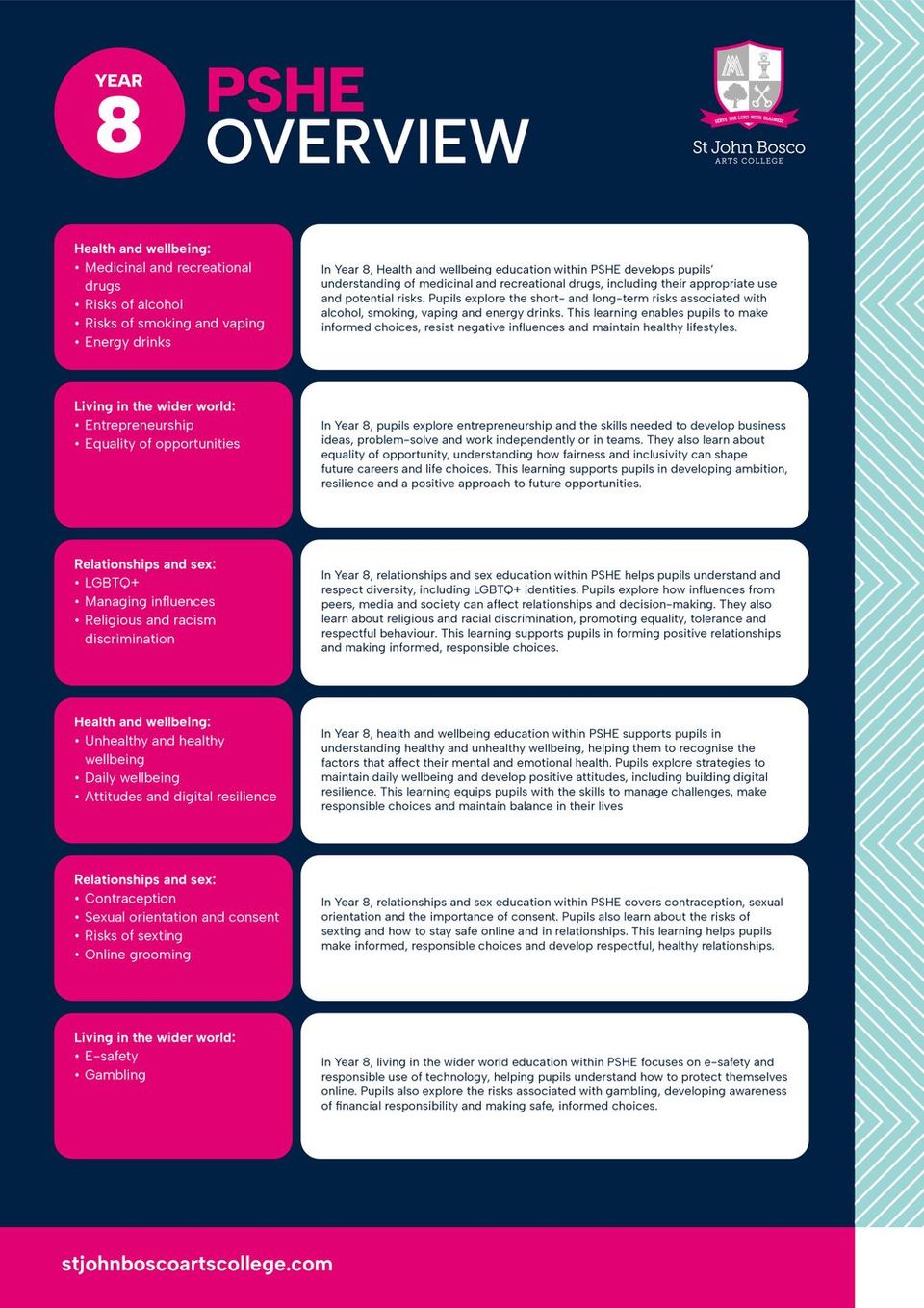 PSHE education at St John Bosco is a core element of the school’s curriculum and reflects our commitment to the holistic development of pupils, in accordance with our Catholic ethos. The programme supports pupils’ personal, social, moral and emotional development, enabling them to become responsible, respectful and informed members of society.